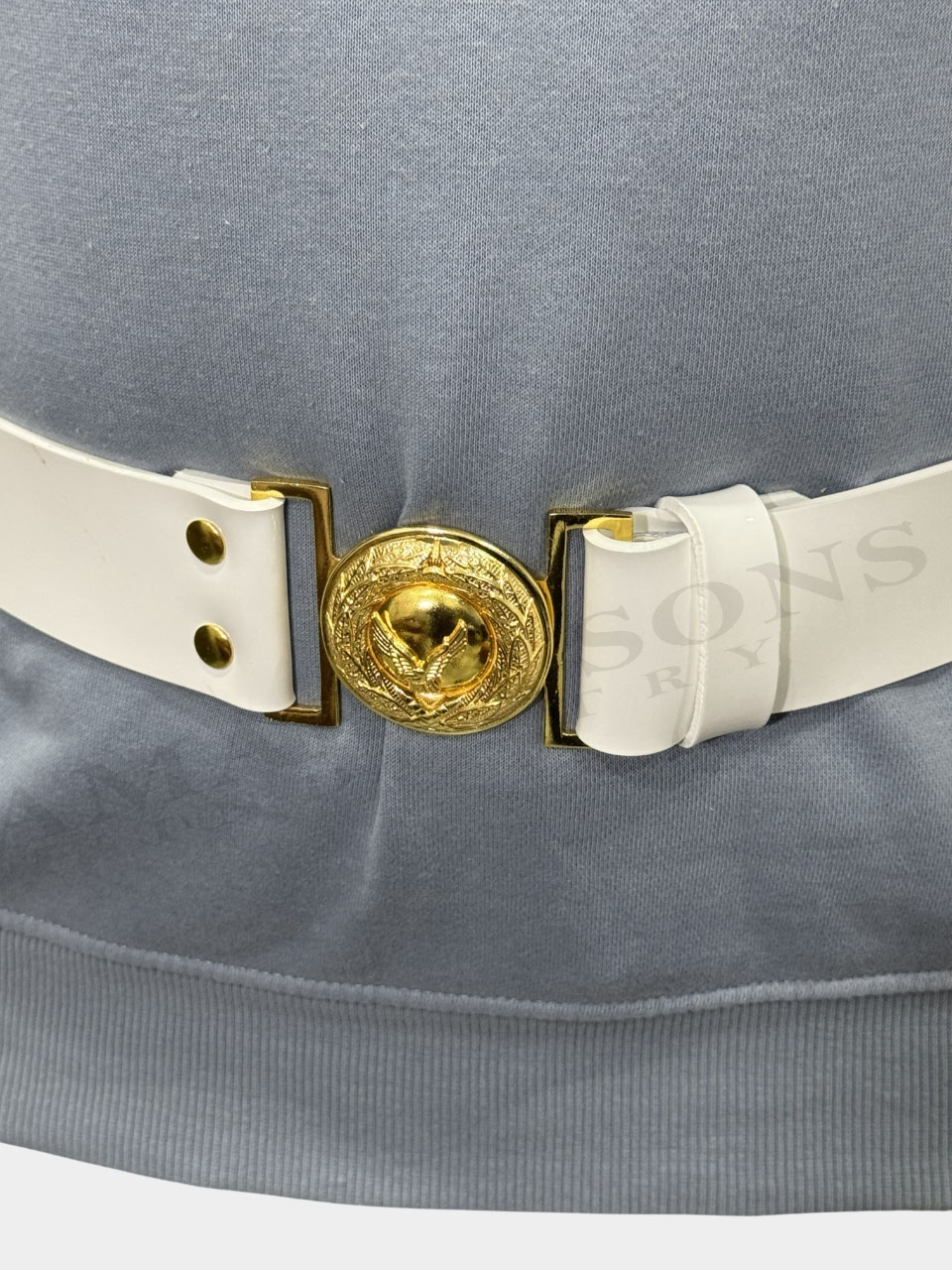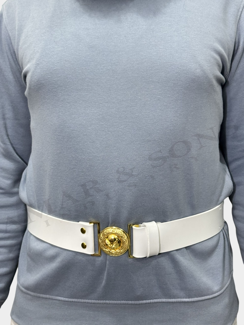 The belt features a smooth white finish that perfectly complements officer uniforms. It is equipped with a strong gold-plated metal buckle, adding an elegant and authoritative look. The sturdy buckle and fittings ensure a secure fit and long-lasting performance.