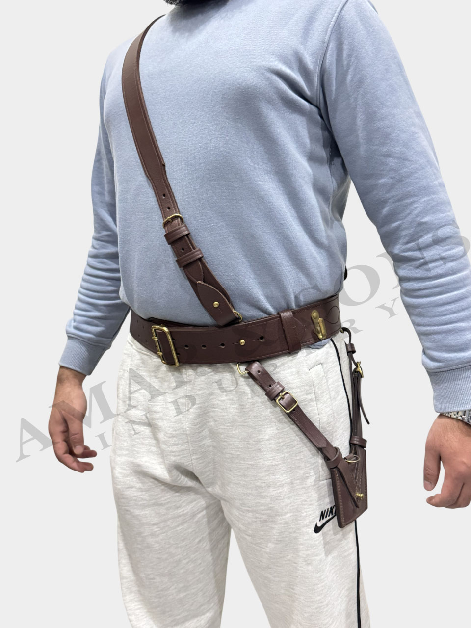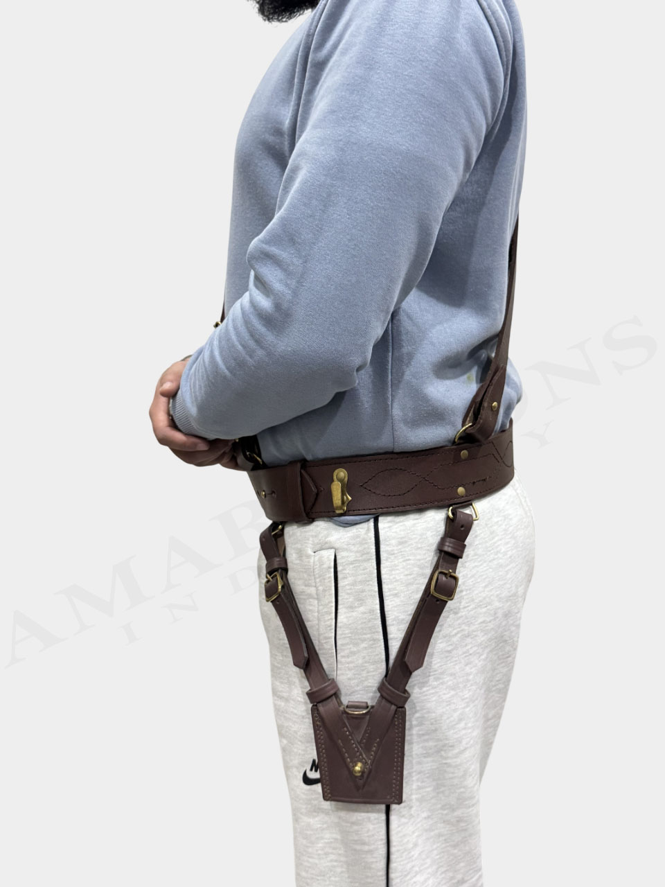 The belt features a matching genuine leather shoulder strap that provides added support and enhances the traditional Sam Browne look. Each belt is carefully stitched with fine decorative stitching patterns, ensuring extra strength and a refined finish. The edges and corners are smoothly edge-grinded for a clean, polished, and long-lasting appearance.
